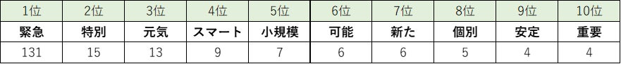 1位「緊急」は、先月同様に1位でした。情報を掲載する際に「緊急対策」「緊急支援」「緊急事業」のように掲載されることが多いため、情報の種類を問わずよく使われています。