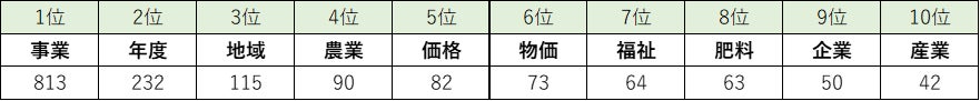 1位「事業」と2位「年度」は情報を問わず利用される名詞のため、他のキーワードに比べて登場頻度が高くなりました。