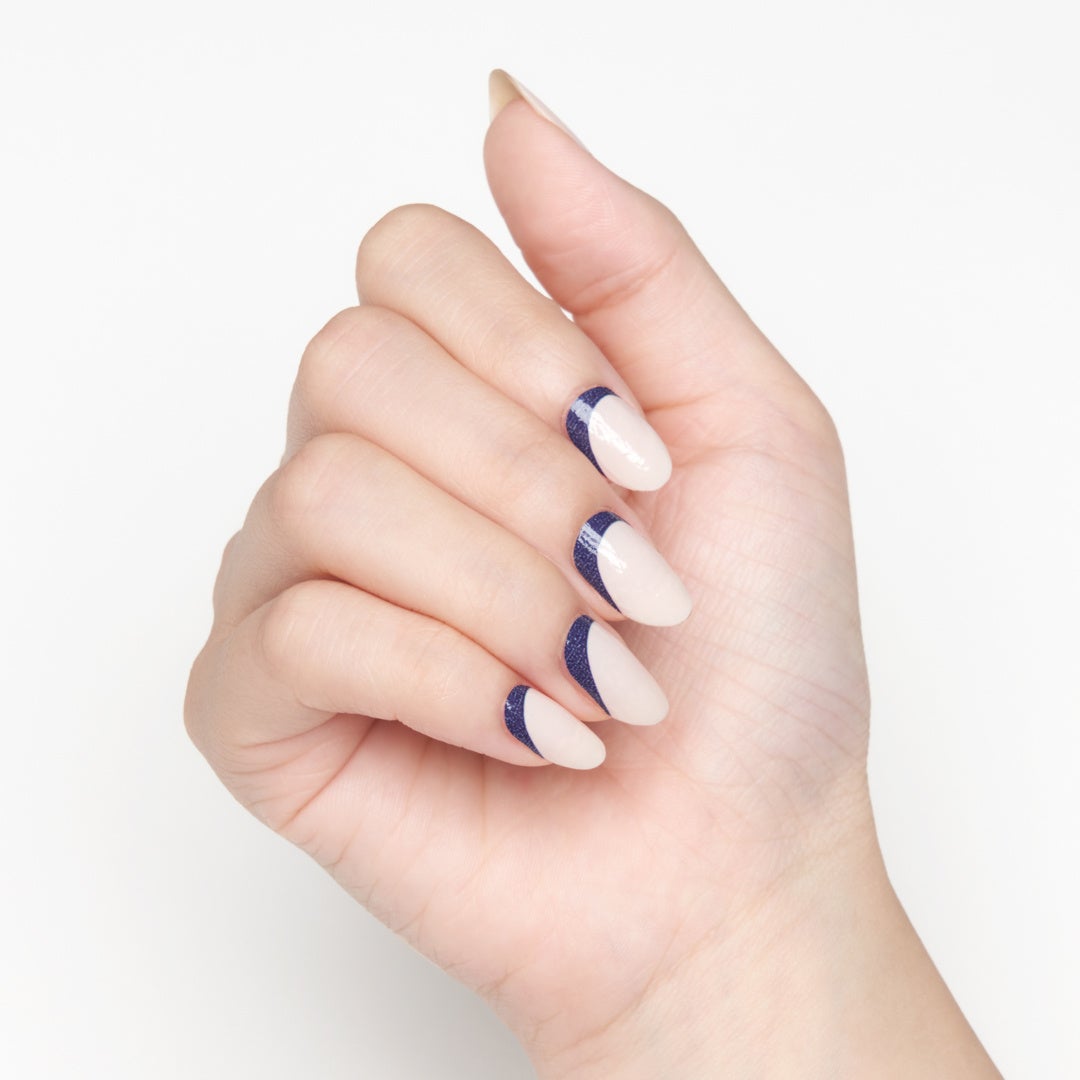 三日月のようなラインが根元に入った変形逆フレンチです。ライトベージュとネイビーのコントラストが美しく、