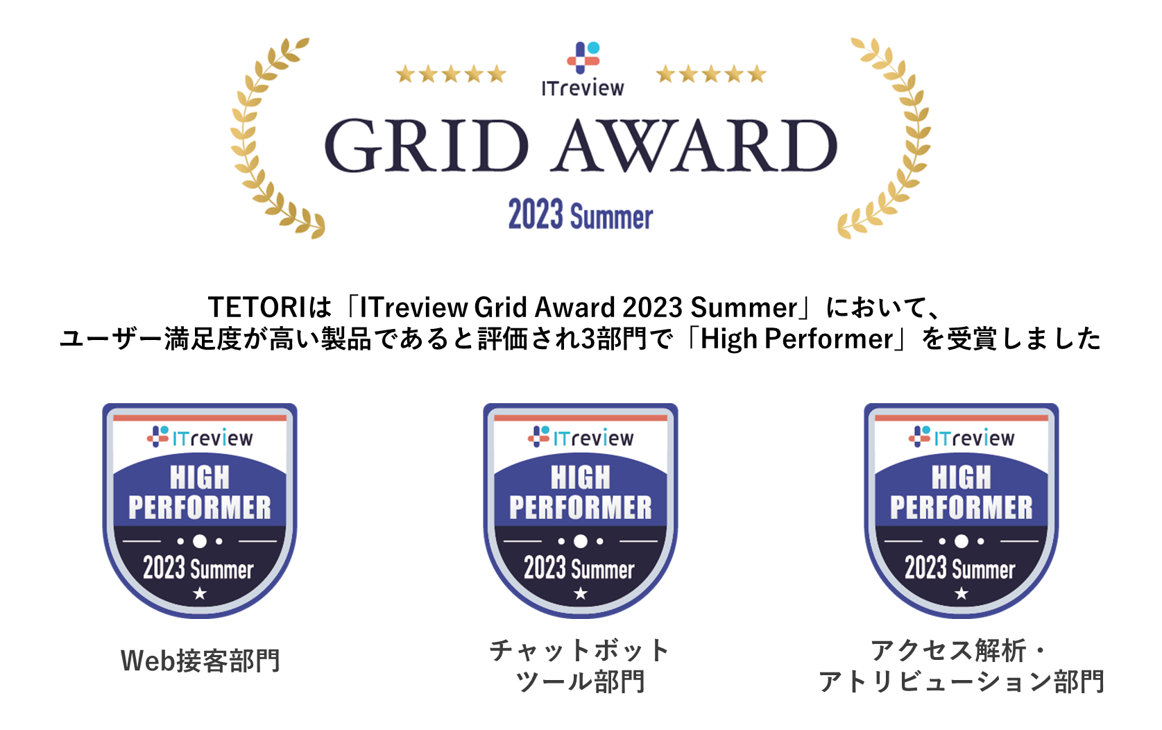 Web接客ツール「TETORI(テトリ)」が「ITreview Grid Award 2023 Summer」3部門で、高いユーザー満足度が評価され「High Performer」を受賞