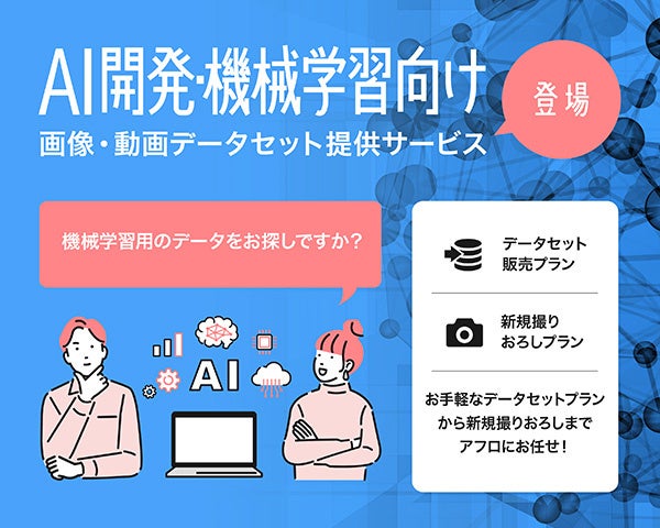 株式会社アフロ(本社:東京都中央区、代表取締役:青木 紘二、以下「アフロ」)は、アノテーション向けプラットフォームサービスを提供する株式会社APTO(本社:東京都渋谷区、代表取締役:高品良、以下「APTO」)と業務提携を行いました。これを受けて、昨今のAI・テクノロジーの発展に合わせて需要が高まっている画像や動画の機械学習向けにデータセット提供を開始いたします。