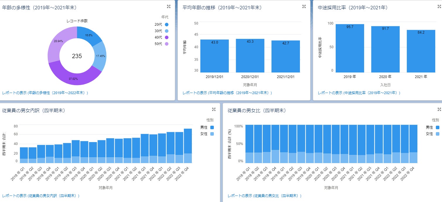 本レポートにはISO30414で中小企業に推奨されている項目に加え、当社のビジネス特性に基づいた独自項目など全24指標を4年度の期間で数値化し、当社人材戦略とともに開示しています。
