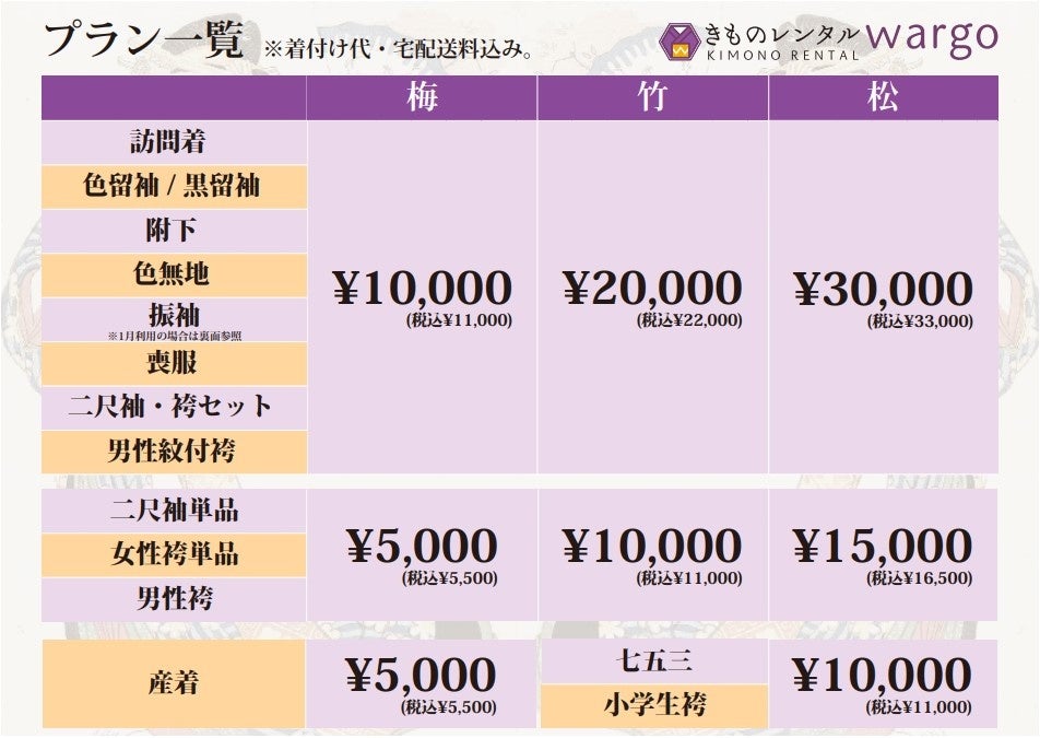 また、wargoは自社開発の予約システム、ICTによる商品管理でコスト削減が実現したことにより低価格でのサービス提供を可能にしました。他にもWEB上でお着物をご覧頂き、ご希望の場所へお届けする宅配レンタルも承っております。