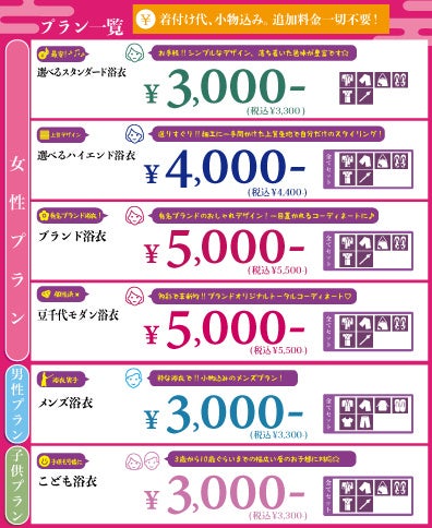 内容 :スタンダード浴衣一式と4大特典付き 通常5,830円~が2,970円で浴衣レンタル
