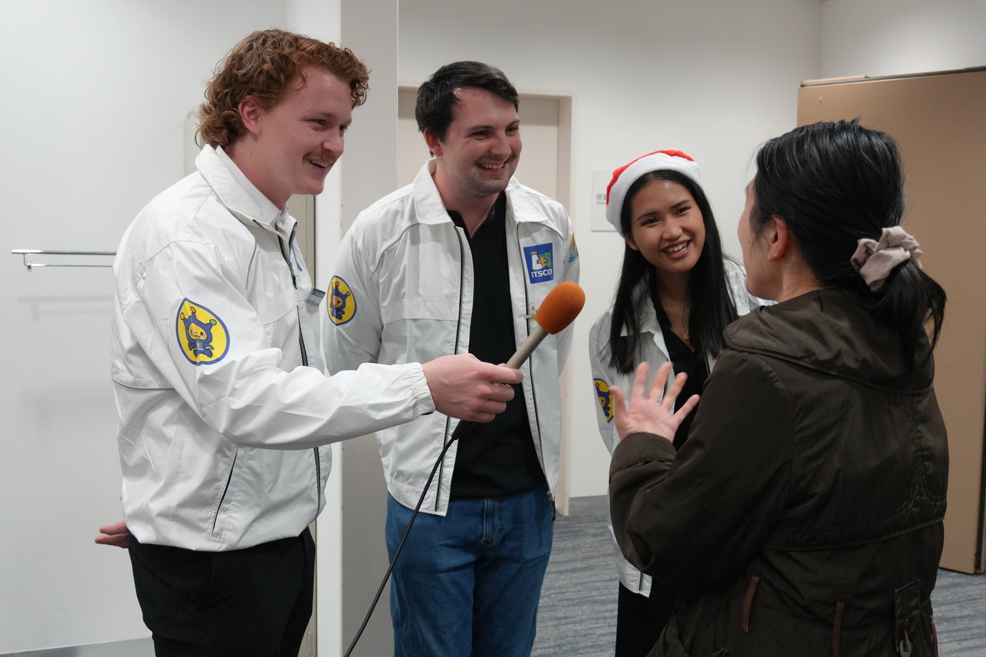 設営などの準備から、開演前の時間帯には来場者と英語でコミュニケーションを取り、会場の雰囲気づくりにも参加。さらに、イベント終了後の感想を来場者の方々に聞くインタビュアーとしての実践的な体験にも挑戦。学生自身の語学力やコミュニケーション力を生かした、印象的な交流の場となりました。