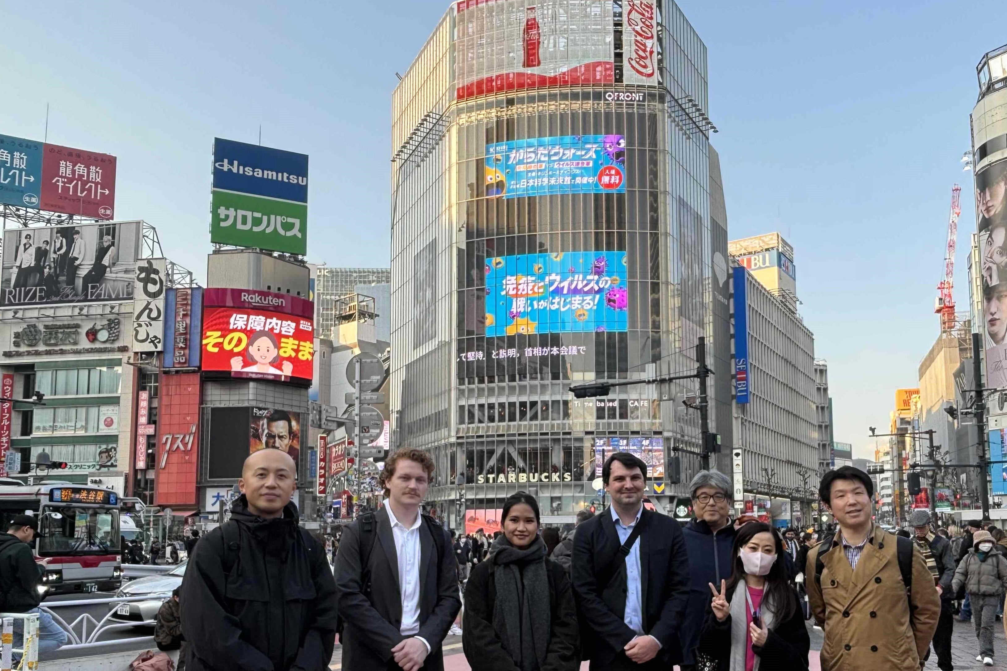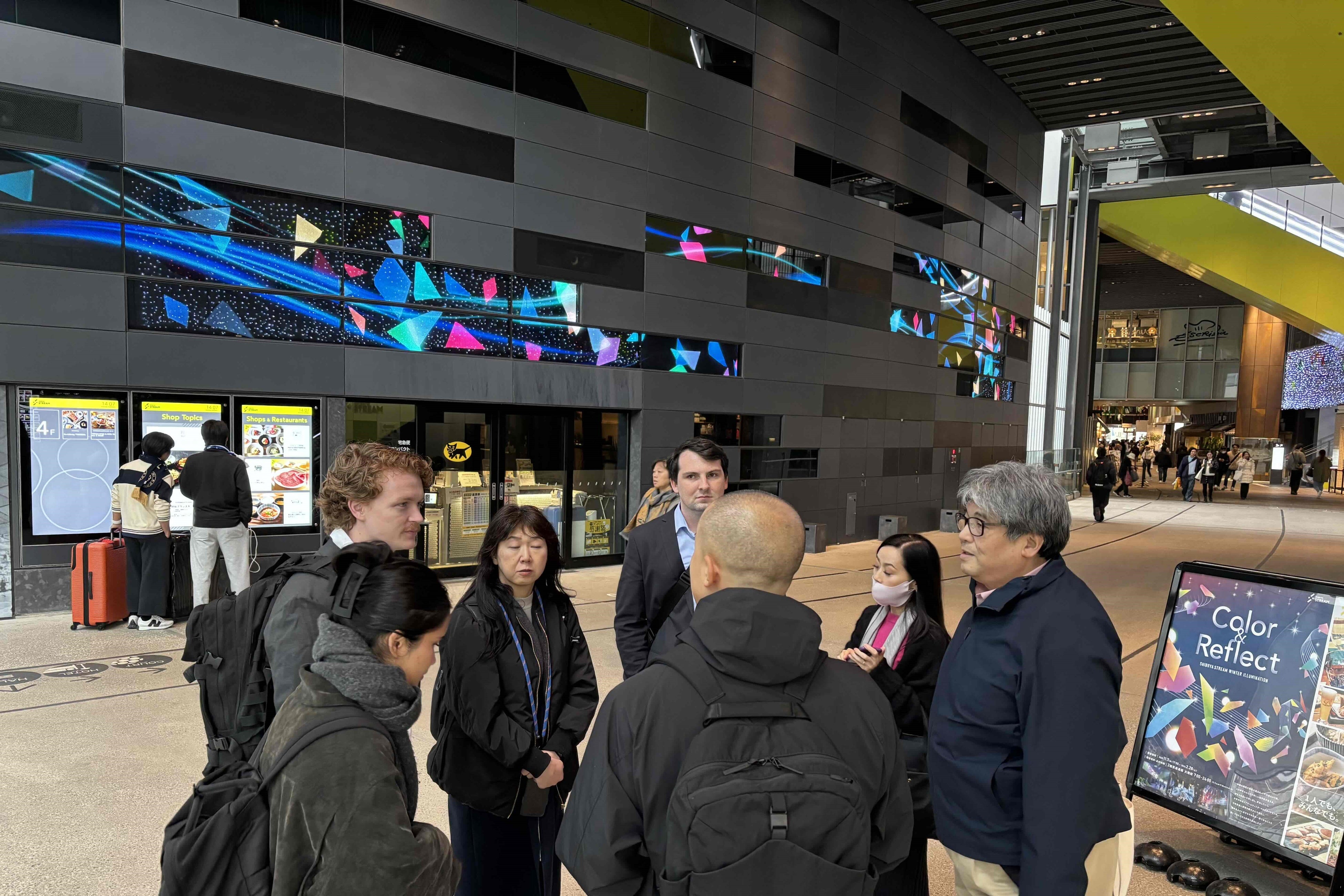 イッツコムが関わる実際のデジタルサイネージを巡り、運用の現場を見学しました。渋谷ストリームの空間演出型のサイネージや、渋谷のスクランブル交差点を象徴する大型ビジョン「QʼS EYE」のほか、新宿の東急歌舞伎町タワーや駒沢大学駅の最新のデジタルサイネージなど、様々なタイプのサイネージを見学し、都市空間や利用シーンに合わせた表現と運用の工夫を学ぶ機会となりました。