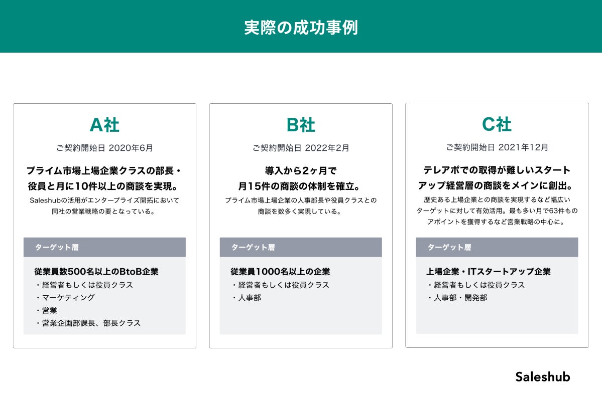 指定した企業名・部署・役職の商談を成果報酬で獲得することができるため、テレアポのような従来の商談獲得手法よりも高精度かつ、顧問サービスなどよりもコストを抑えた決裁者商談を実現していることから、最近ではWeb広告などのデジタルマーケティングでの商談獲得コストの上昇傾向も背景に、デジタルマーケティングの予算範囲において『Saleshub』を選択する企業も増加しつつあります。