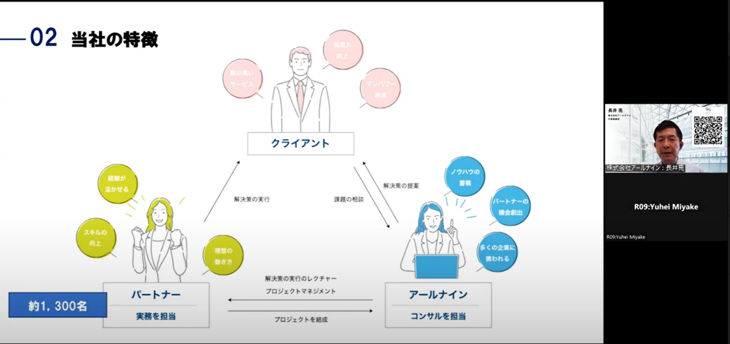 当社の競合となる他企業の多くは、採用に困っている企業に人材を派遣するか、社員自ら代行する形で支援しています。一方、当社はキャリアコンサルタントの資格や、人材業界・企業人事の経験を持つ「パートナー」(2023年9月時点約1370人)と呼ばれる社外人材に業務委託する形で、支援えきるのが最大の特徴です。