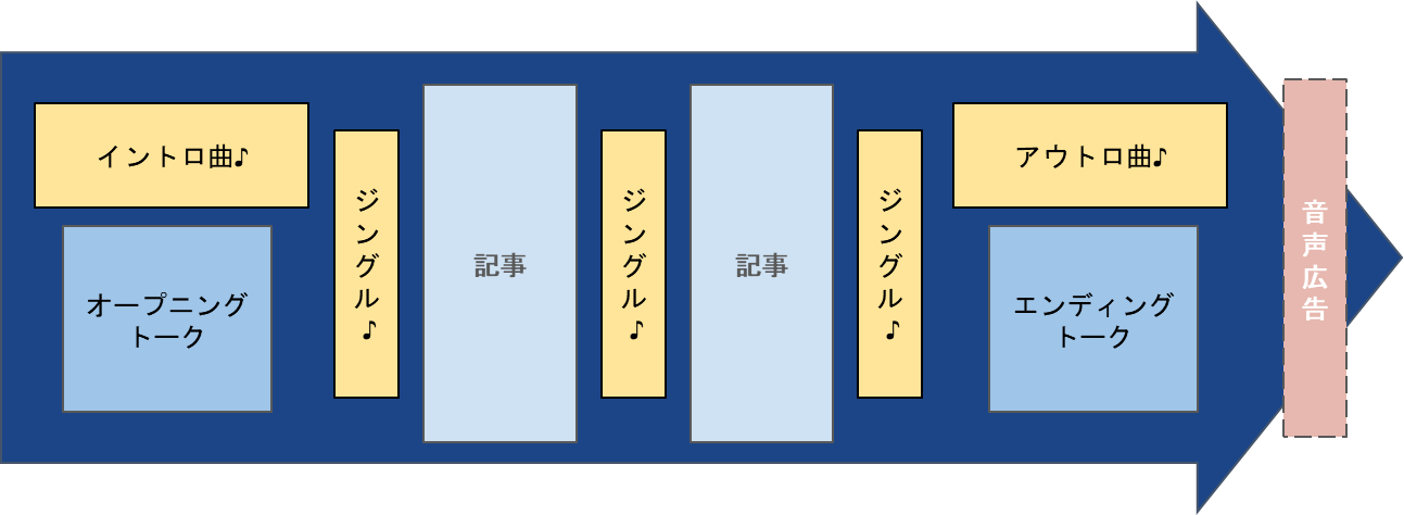 - 音声化した記事に冒頭のイントロ曲とオープニングトーク、記事の間にジングル、最後にエンディングトークとアウトロ曲を挿入します。これにより複数の記事をまとめたリッチな音声番組の配信が可能になります。イントロ曲やアウトロ曲はメディア様のお好みの曲を設定することが可能です。音源は株式会社オーディオストックの音源ストックサービス「Audiostock」からさまざまなジャンルの曲を事前にピックアップしています。また、オープニングトークやエンディングトークについてもメディア様のお好みの内容にすることが可能です。