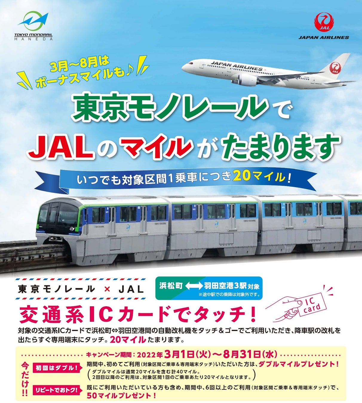 モノレール浜松町駅⇔羽田空港各駅(第3・第1・第2ターミナル)間を、交通系IC カード(スマートフォン等に搭載したものを含む)で自動改札を通ってご乗車いただき、改札外の専用端末にご利用の交通系ICカードをタッチいただくことで、もれなく1 回のご乗車に対してJALのマイルを20 マイルプレゼントしています。