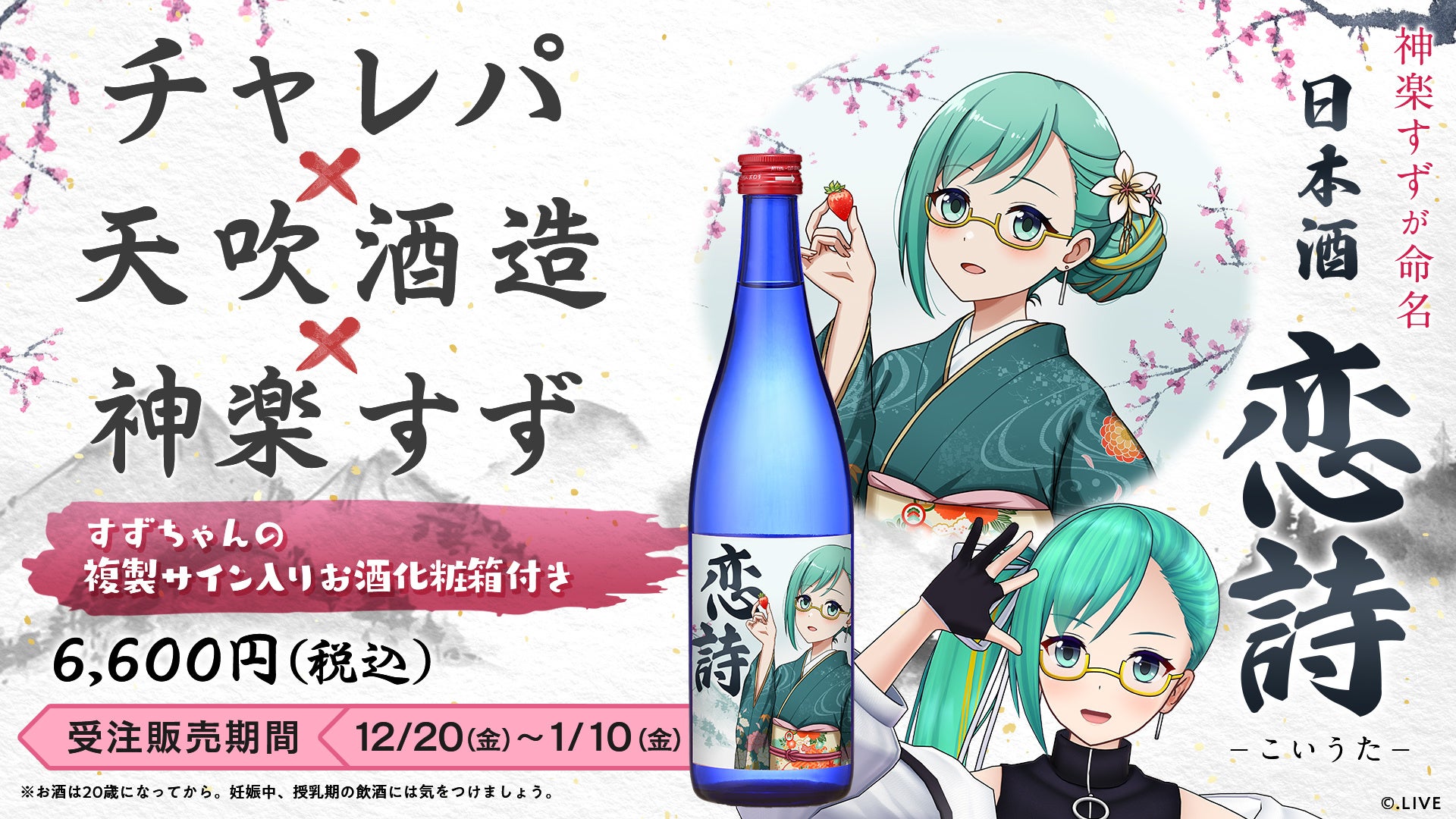 神楽すず初のコラボ日本酒となる『恋詩 -こいうた-』の受注販売が、オンラインショップ『Challepa online shop』にて2024年12月20日(金)よりスタート!2025年1月10日(金)までの期間限定販売となっていますので、この機会にぜひご賞味ください!