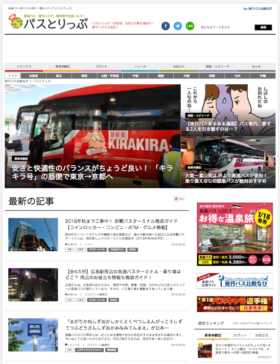 高速バス・夜行バスの旅行・観光メディア。バス旅を快適にするお役立ち情報をはじめ、プロのライター・漫画家が30人以上在籍し、旅行先の観光地・グルメ情報など、月に約70本の記事を掲載。また全国のバス会社キャラクターNo.1を決定する「バスキャラ選手権」やバスとりっぷの乗車記で紹介された豪華バスの中から人気No.1を決める「人気豪華バス決定戦2017」を開催するなど、夜行バス・高速バス利用者に独自のアンケート調査を展開しています。