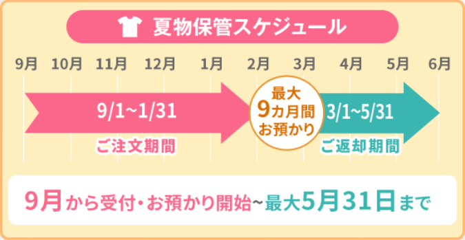 夏物保管パックは9月~5月迄最大9ヶ月間お預かりいたします。