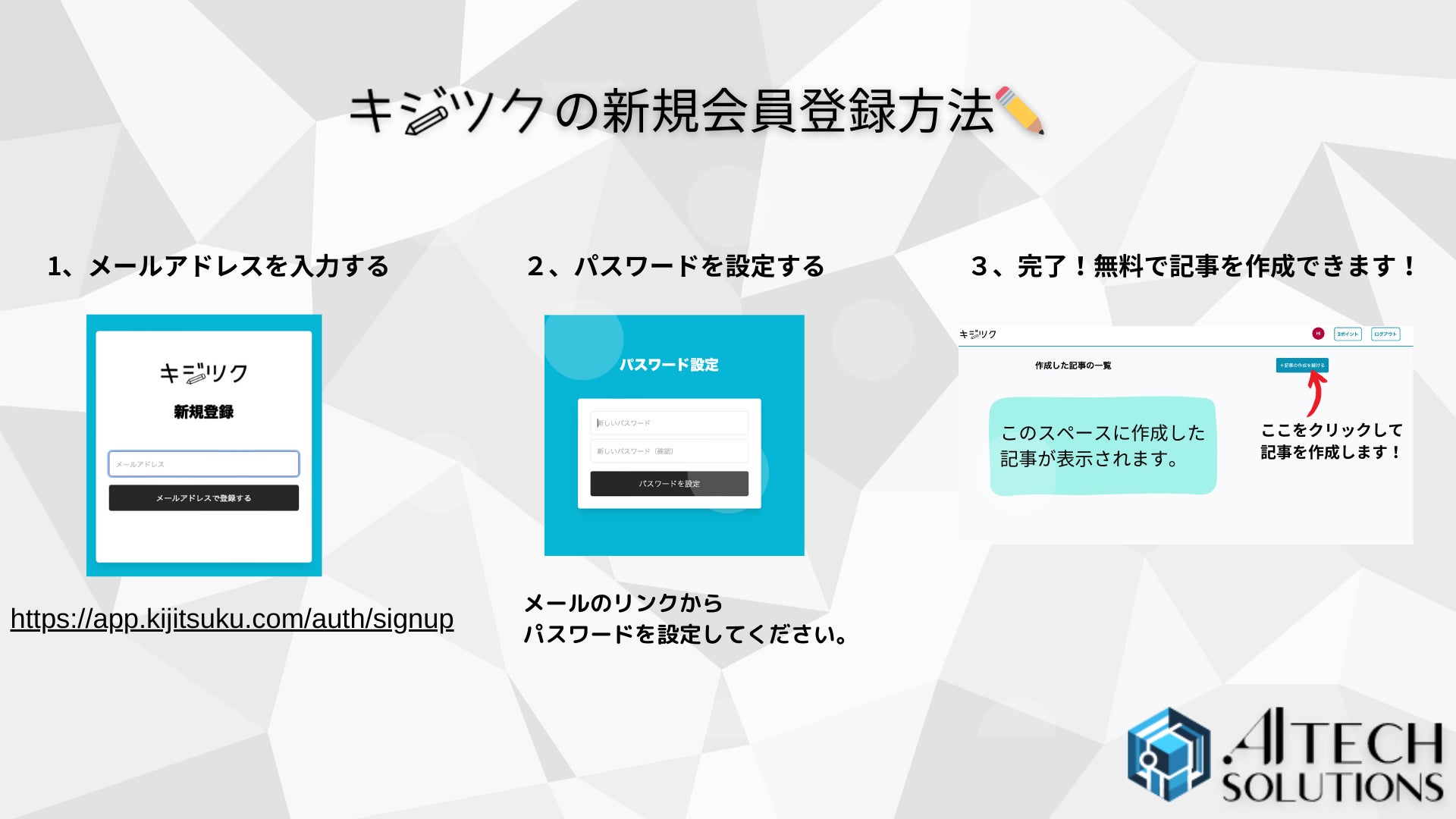 AI Tech Solutionsは、2024年10月1日、Web記事の作成に特化したテキスト生成AIツール「キジツク」(https://kijitsuku.com)の提供を開始いたしました。キジツクを活用することで、10分程度で構成の作成から記事の執筆までを完了させることができます。またWebライター、ディレクターとして知っておくべき基礎知識や、Webメディア運用のノウハウをお届けする「キジツクマガジン」(https://kijitsuku.com/archives/category/list-all)も同時にオープンいたしました。