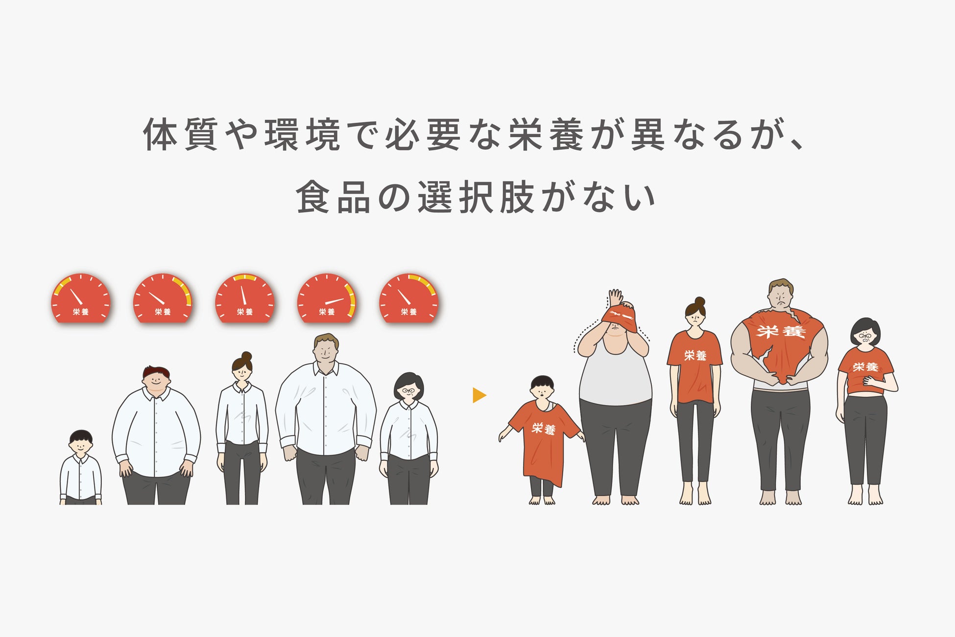 衣服は体の大きさに合わせて自分に合ったサイズ選びができるのは当たり前です。しかし食品においては、体質や環境によって必要な栄養が異なるにも関わらず、同じ栄養価が配合された食品しか選択することができませんでした。