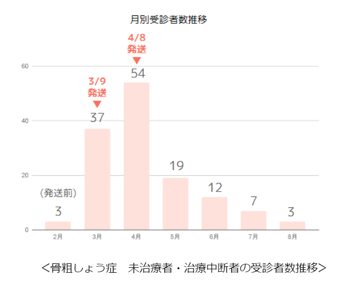 本事業では、骨粗しょう症に関する検査や受診を促すため、勧奨通知の送付を行いました。その結果、通知を送付した2022年3月から8月までに合計132人が医療機関を受診し、受診率は29.5%(132人/448人※)となりました。勧奨通知発送前の2月は受診者が3人であったことに対し、3月は37人に増加する結果が得られました。
