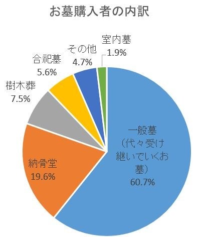 一番多かったのは、一般墓で60.7%、納骨堂が19.6%、樹木葬が7.5%という結果となった。また、年齢の内訳では年齢のグラフの通り、サンプル数は40代から70代までが約2割前後の割合となっている。また、お墓を購入した方の年代で最も多かったのが40代で28.0%、次いで50代(24.3%)、60代(23.4%)、70代(19.6%)と続く。