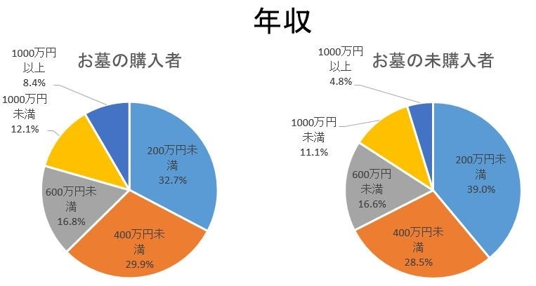 年収を比較すると、お墓の購入者の方が、“200万円未満”と回答した方の割合が、未購入者と比較して6.3ポイント少ない。また、“400万円以上”と回答した方の合計が、お墓購入者の方が6.2ポイント多い結果となった。お墓の購入者の方が比較的に年収が多い傾向にある。
