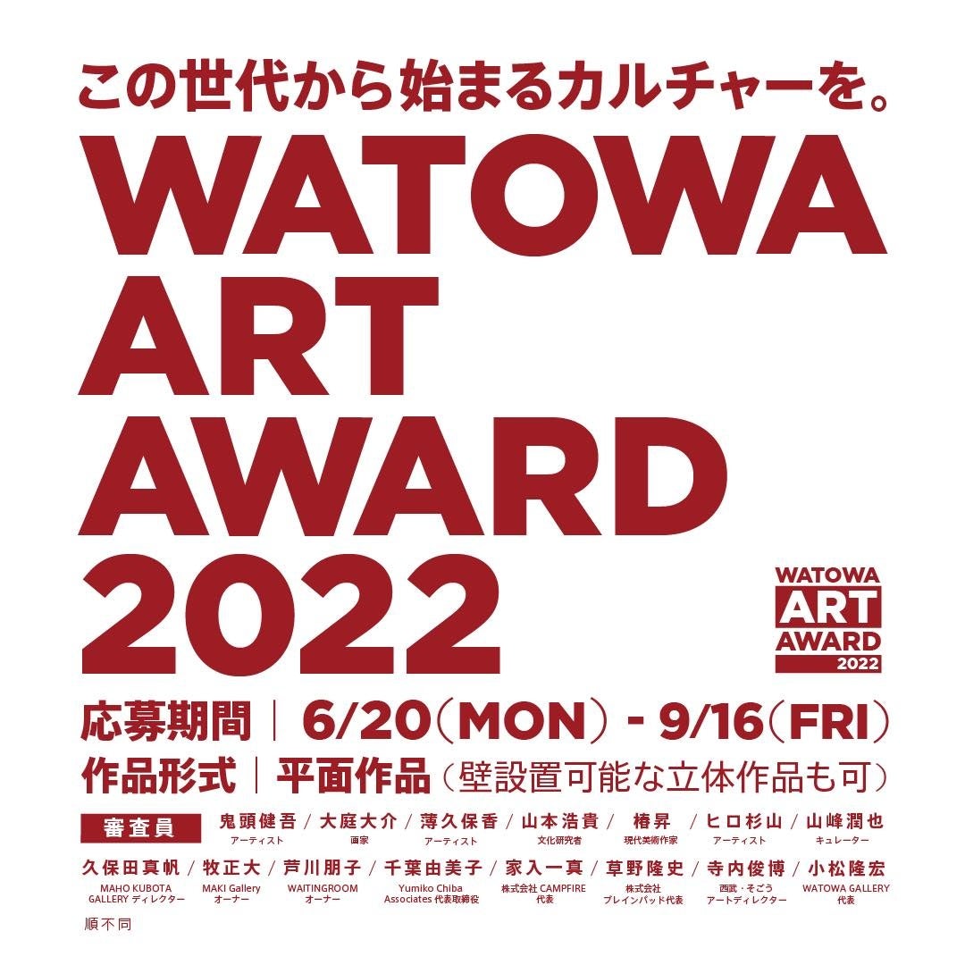 2回目となる今回は、6月20日(月)~9月16日(金)の募集期間後、画像資料による一次審査、作品実物による二次審査を経て、12月19日(月)~26日(月)に開催する「WATOWA ART AWARD 2022 EXHIBITION」にて、ファイナリスト作品の展示とともに受賞作品を発表。グランプリにはWATOWA GALLERYプロデュースによるソロエキシビジョンの開催権、準グランプリにはグループエキシビジョンへの参加権を授与するとともに、グランプリにはソロエキシビジョンに向けた制作協力金50万円を提供いたします。審査員賞も設置し、各ジャンルにおいて活躍する審査員毎に様々なサポートを用意いたします。