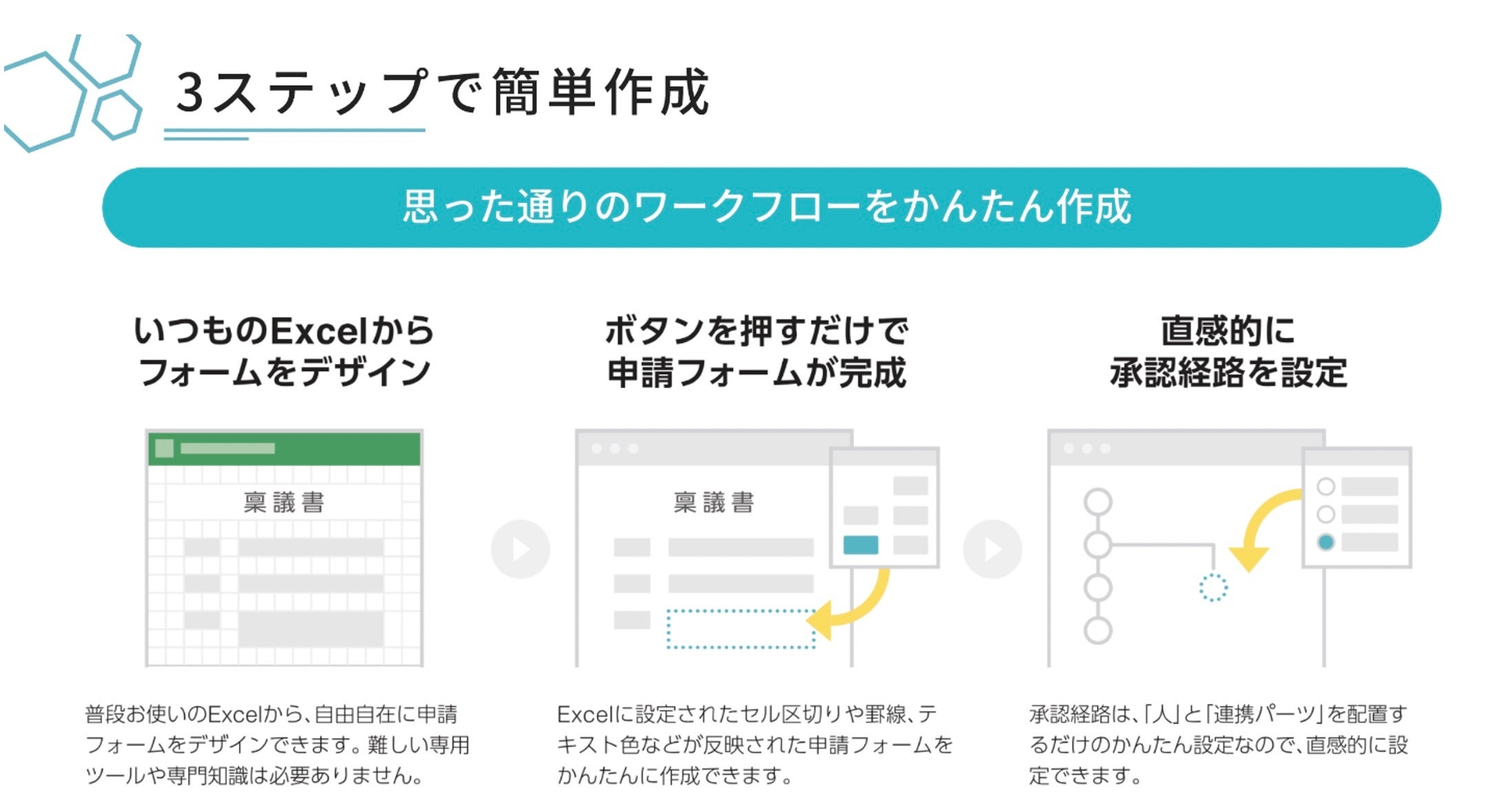 「コラボフロー」は、Webが使える方なら誰でも簡単に作れ直せる、直感的な操作性を持つワークフローシステムです。稟議の承認や見積もり発行、入社手続きなど、紙や人に依存した社内のワークフローを改善し、場所を選ばず活用できます。今お使いのExcel帳票をそのままWebフォームに変換できるため、社内の申請・承認の業務改善を簡単に始められます。