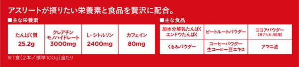 1食(製品2本分)で良質なたんぱく質25.2gを素早く補給できるほか、カフェインやテオブロミンなどのメチルキサンチン、複数の食品を由来とするポリフェノール類などの栄養素を供給します。
