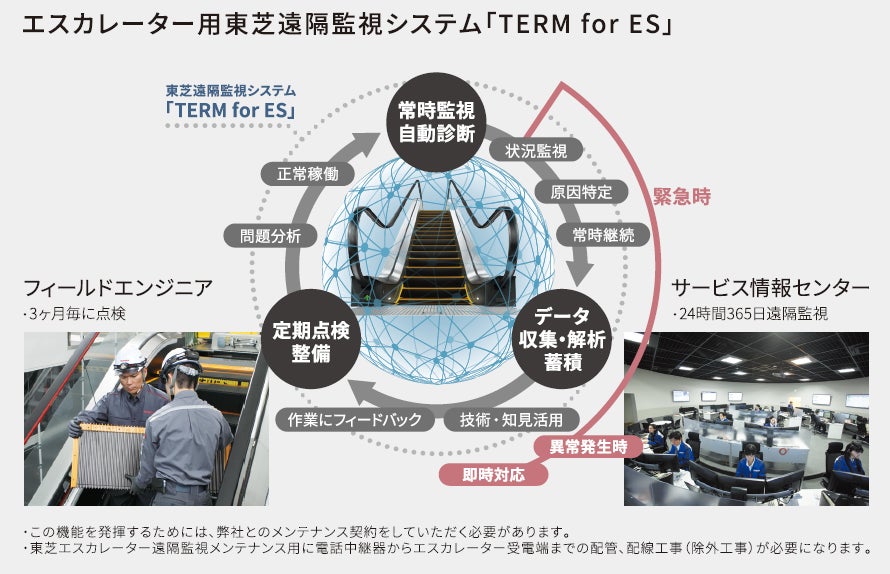 東芝遠隔監視システム「TERM for ES」の“Kindmover”シリーズへの適用は、遠隔監視システムに必要な機器の設置工事と、当社との保守契約が必要となります。本システムの導入により、品質の維持や、より適切なタイミングでの機器の調整、交換ができるよう、保守サービスの更なる向上を目指します。
