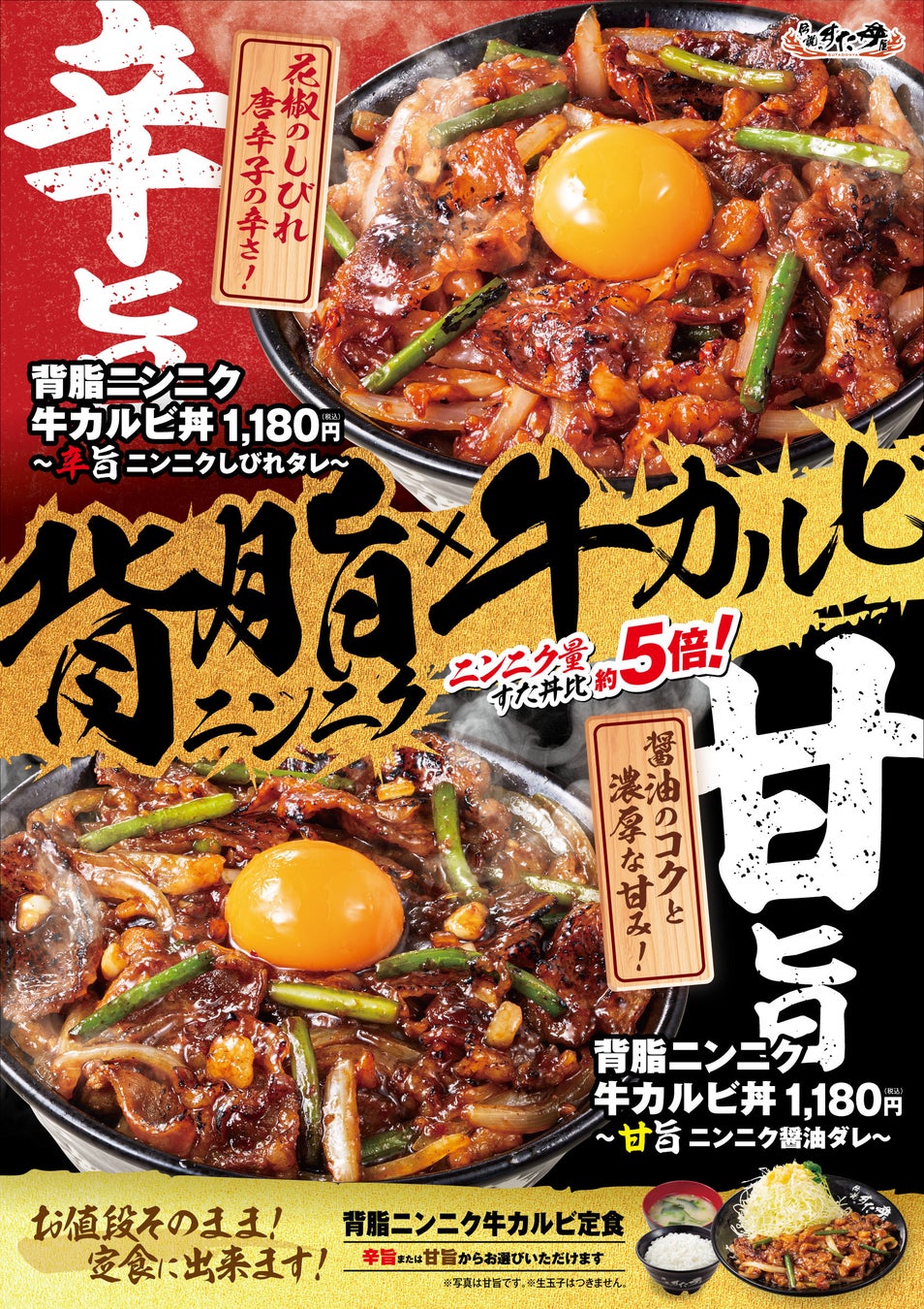 あなたはどちらを選ぶ?花椒と唐辛子のしびれる辛さの「辛旨」!醤油のコクと濃厚な甘みの「甘旨」!双璧を成す『背脂ニンニク牛カルビ丼』が登場!