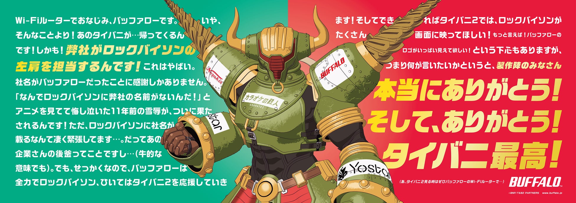 ただのファンによる御礼広告になってしまいましたが、この広告を通して『TIGER & BUNNY 2』をもっと多くの方に知っていただき、欲を言えばロックバイソンをぎゅうっとたくさん見て欲しいと思っています。さらに欲を言えば、バッファローのWi-Fiルーターをご利用いただき、サクサクとストレスなく本篇をご覧いただきたいと思っています!
