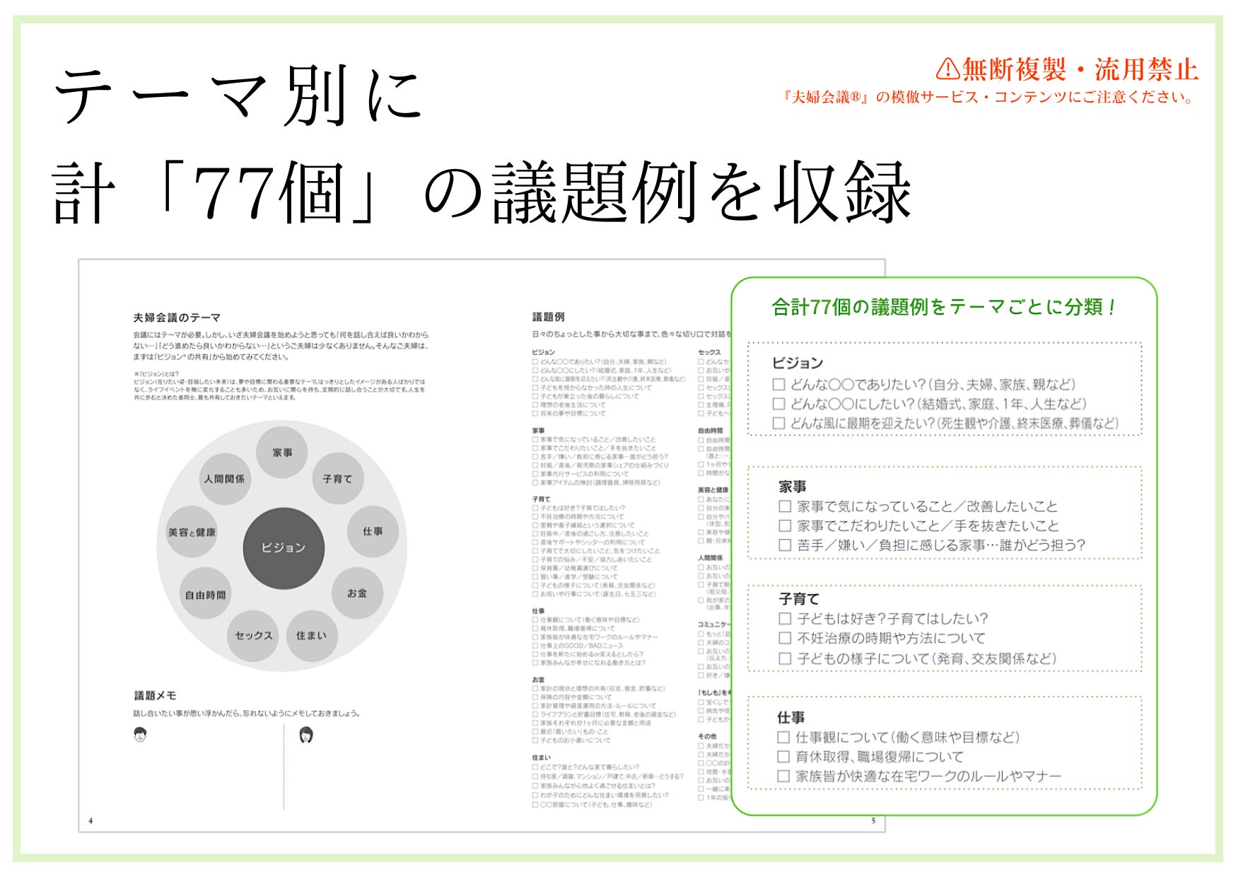ビジョン、家事、子育て、仕事、お金、住まい、セックス、自由時間、美容・健康、祖父母との人間関係など、産後にズレが生じがちな10のテーマに的を絞って質問や例題を設定。夫婦を世帯の共同経営者に見立てた「世帯経営」というオリジナルの概念を用いてふたりで問いに向き合う内に、大切なことを前向きな気持ちで「対話」できる夫婦関係が育まれます。
