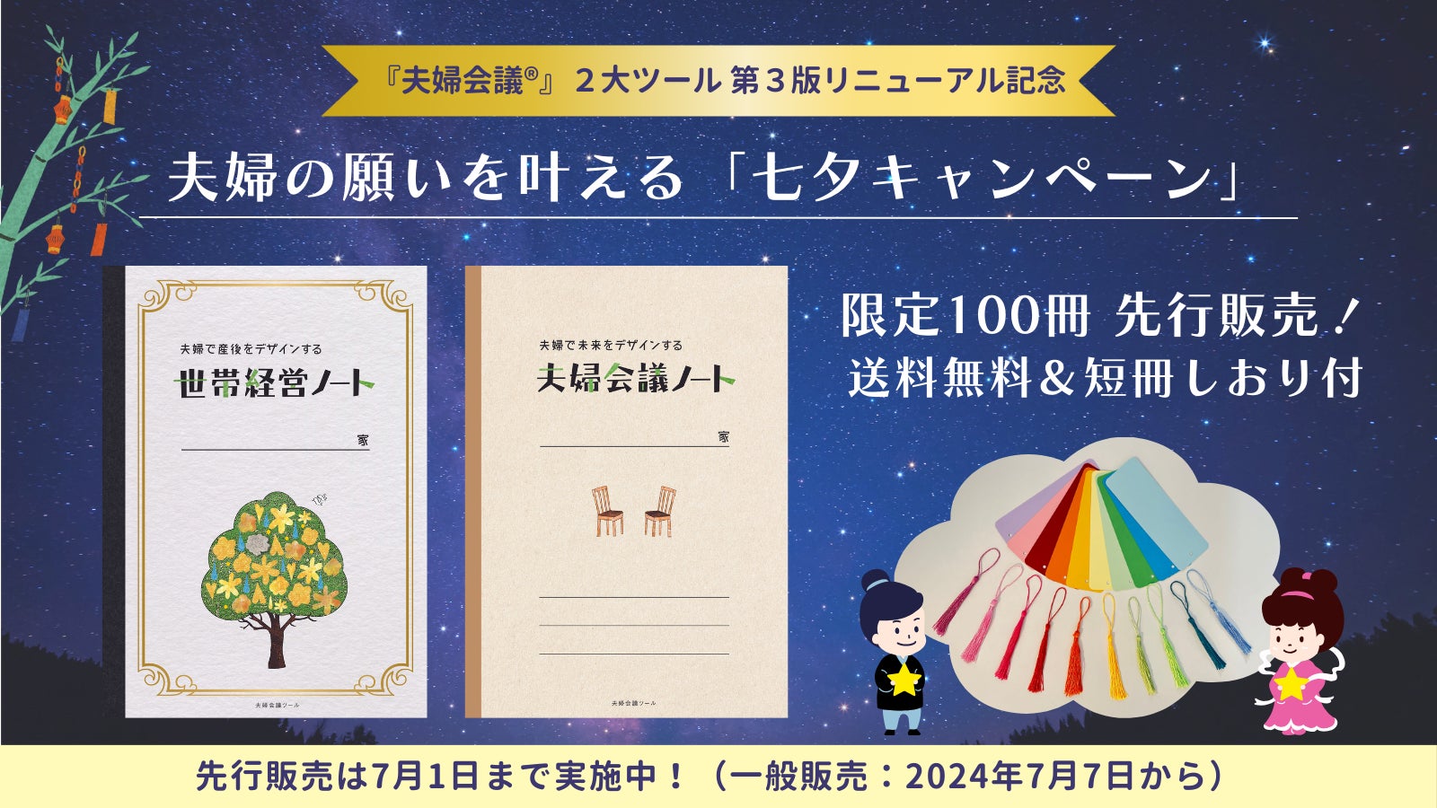七夕の日に、ご夫婦で短冊しおりに願いを書いて、更に「世帯経営ノート」や「夫婦会議ノート」で『夫婦会議®』をお楽しみいただけましたら幸いです。お得な先行販売の機会をぜひご利用ください!