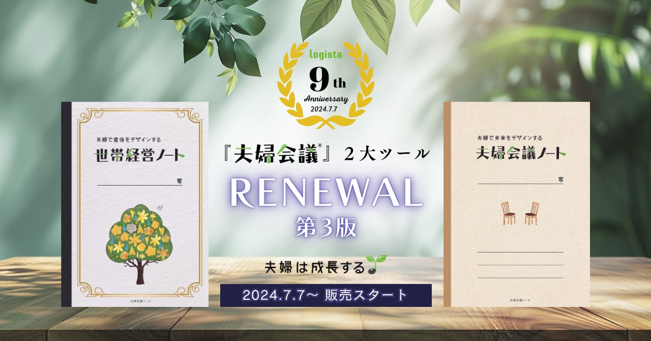 今年2024年7月7日の9周年より、夫婦の対話メソッド『夫婦会議®』の2大ツール「世帯経営ノート」「夫婦会議ノート」をリニューアルの上、一般販売を開始いたします。また、リニューアルを記念し「送料無料!夫婦の願いを叶える七夕キャンペーン」と題した先行販売をスタートしたことをお知らせします。