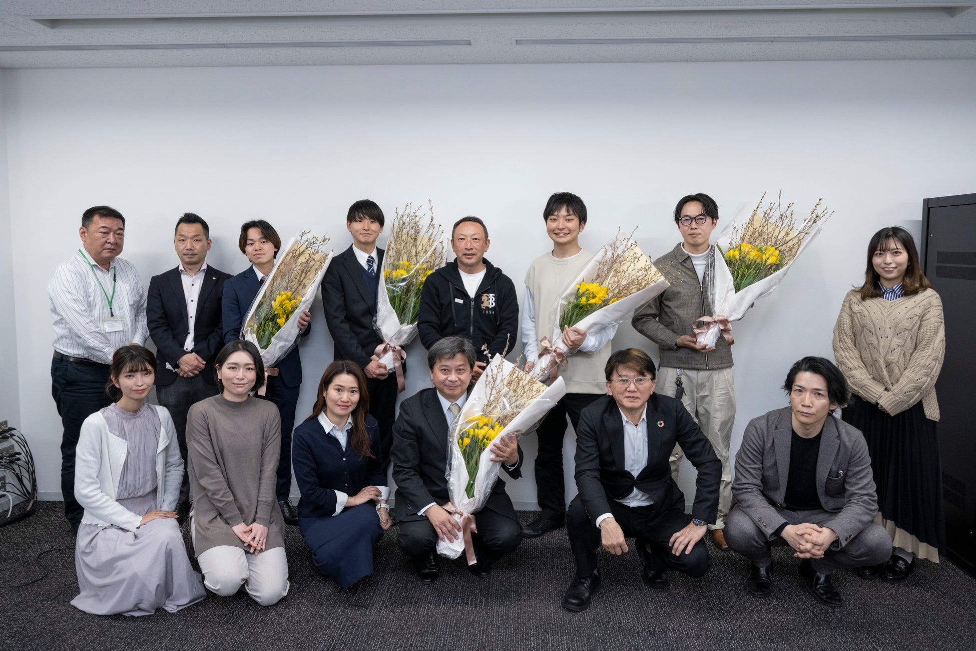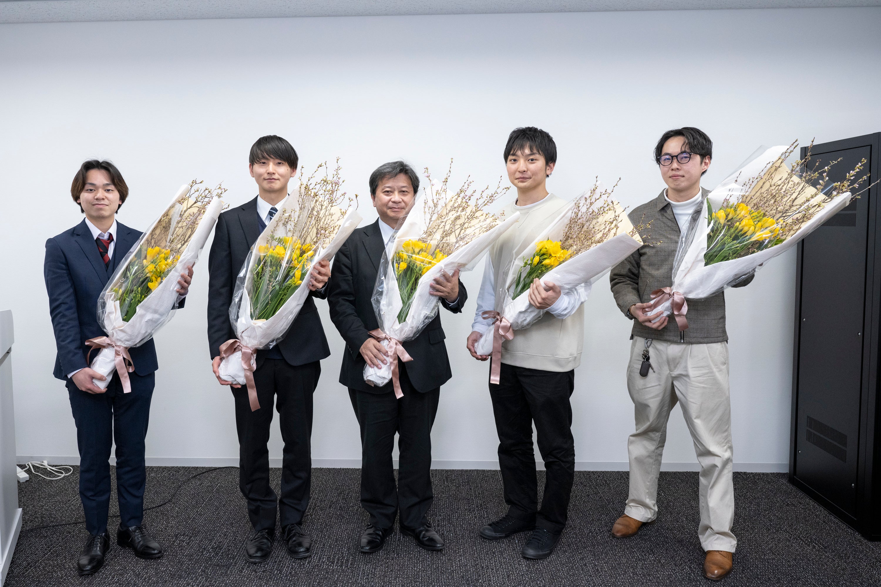 発表会の最後に、花キューピット関係者とともに1年間共同研究を行った三野さん、高木さん、川野さん、遠藤さん、そして朝日教授に花キューピットから桜とフリージアの花束を贈呈いたしました。花束を手に記念撮影も行われ、笑顔で共同研究を終了いたしました。今後はこの成果を花キューピットで引き継ぎ、引き続き事業化に向けて検証を進めてまいります。