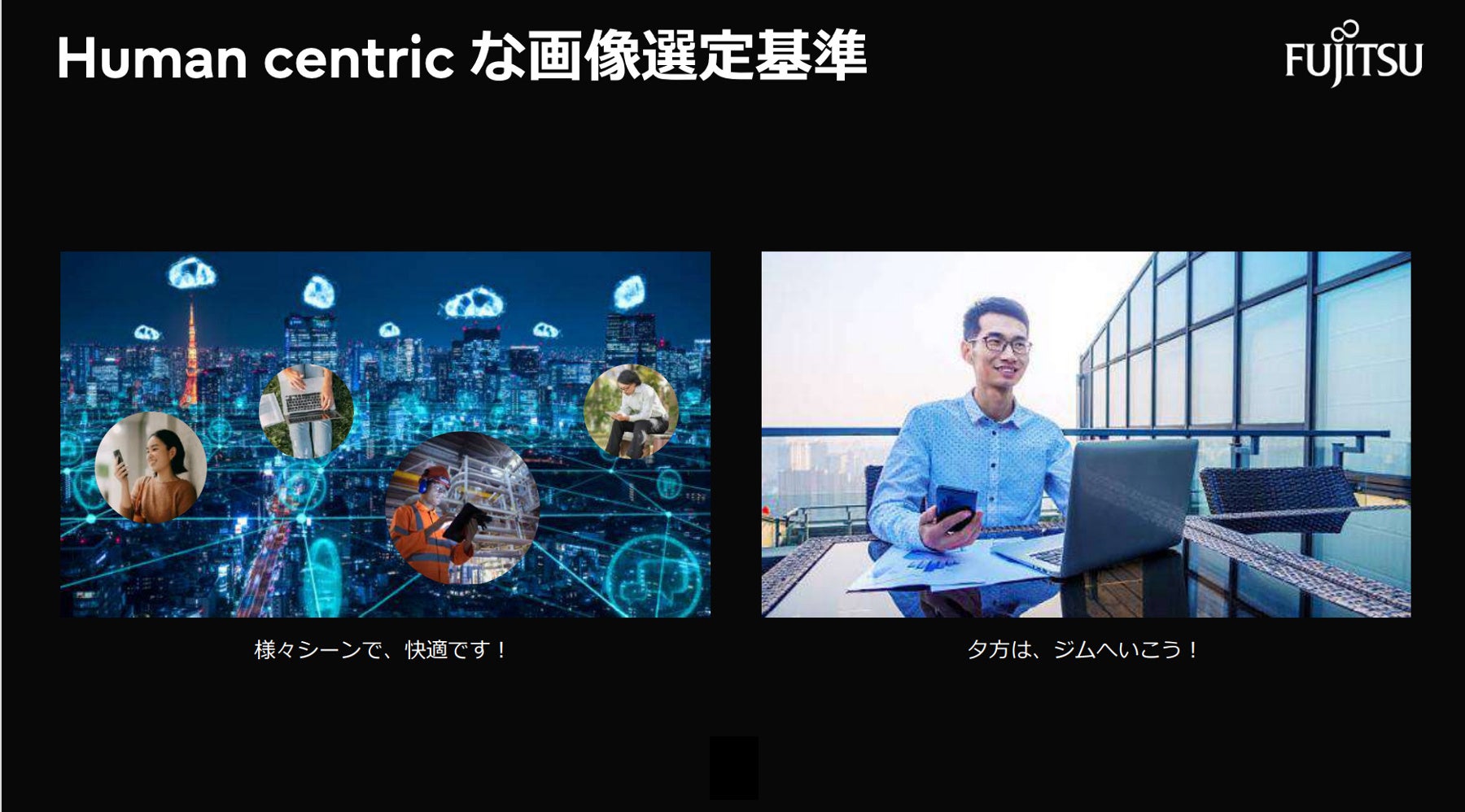 制作したガイドライン集やライブラリ集には、ゲッティイメージズの画像を使用していることを明かし、「ビジュアルアイデンティティガイドラインの中に、富士通らしい画像の選定基準をまとめています。グローバルのお客様に共感頂ける事を目指していますが、弊社はターゲットとなる業種が幅広いため、グローバルにおける多くの業種シーンや、生活シーンが必要になります。またダイバーシティ、エクイティ&インクルージョン(DE&I)も重要になります。ゲッティイメージズの素材は、そういった弊社のニーズに対して、グローバル品質が確保され、様々な業種シーンや生活シーン、また、ダイバーシティ、エクイティ&インクルージョンに配慮した豊富な素材が揃っていますので、大変有効に活用させて頂いております。」と紹介しました。