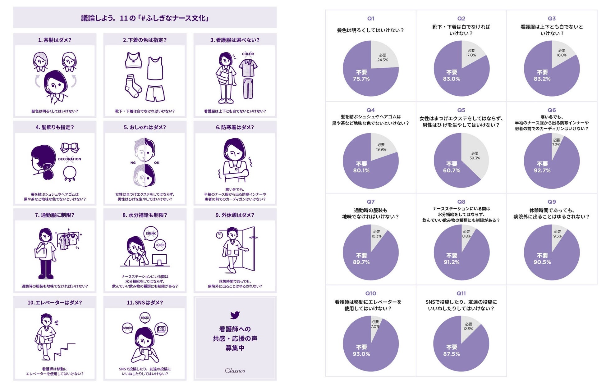 クラシコは2022年9月、看護師・病院利用者・病院幹部を対象に行った調査を発表。賃金や福利厚生よりもより身近で、看護師の自由な働き方を縛っている独特なルールや慣習(=「ふしぎなナース文化」)があることが明らかになりました。