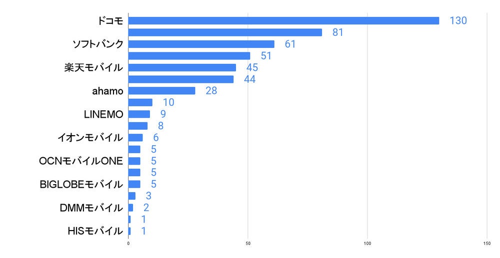 「現在契約しているキャリアを教えてください」という質問をしたところ、ドコモやau、ソフトバンクといった大手キャリアを契約している方に多く回答していただいたことがわかりました。