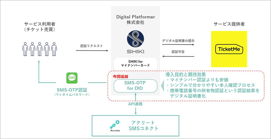 株式会社アクリート(本社:東京都千代田区、代表取締役社長:田中優成、以下「当社」)と、Digital Platformer株式会社(本社:東京都千代田区、代表取締役CEO:松田一敬、以下「Digital Platformer」)は、このたび、Digital Platformerが提供する分散型ID(DID)基盤(サービス名「SHIKI」)と当社の「SMSコネクト」をAPI連携させ、SMS-OTP(ワンタイムパスワード)による携帯電話番号の所有物認証の結果をデジタル証明書とする「SMS-OTP for DID」を共同で開発いたします。