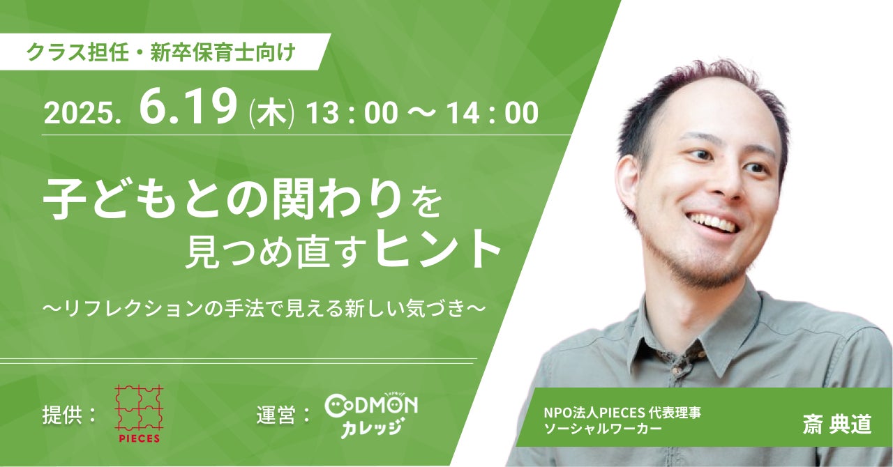 子どもの孤立の解消に取り組むNPO法人PIECES(所在地:東京都文京区、代表:斎 典道)は、保育・教育施設向けICTサービス提供社の株式会社コドモン(所在地:東京都品川区、代表:小池 義則)が運営する、保育者向けオンライン研修サービス「コドモンカレッジ」において、2025年6月より研修動画およびライブ配信型(以下、ライブ研修)の研修提供を開始いたします。