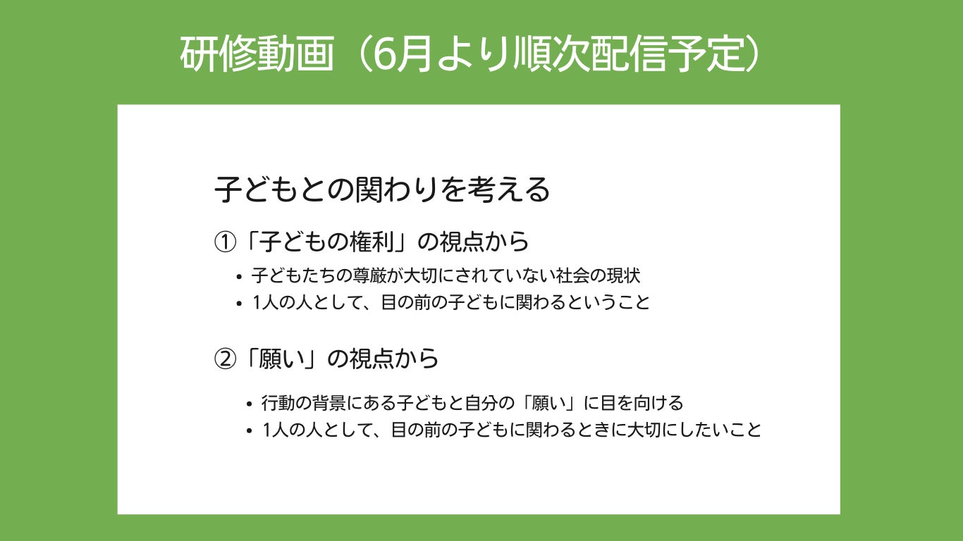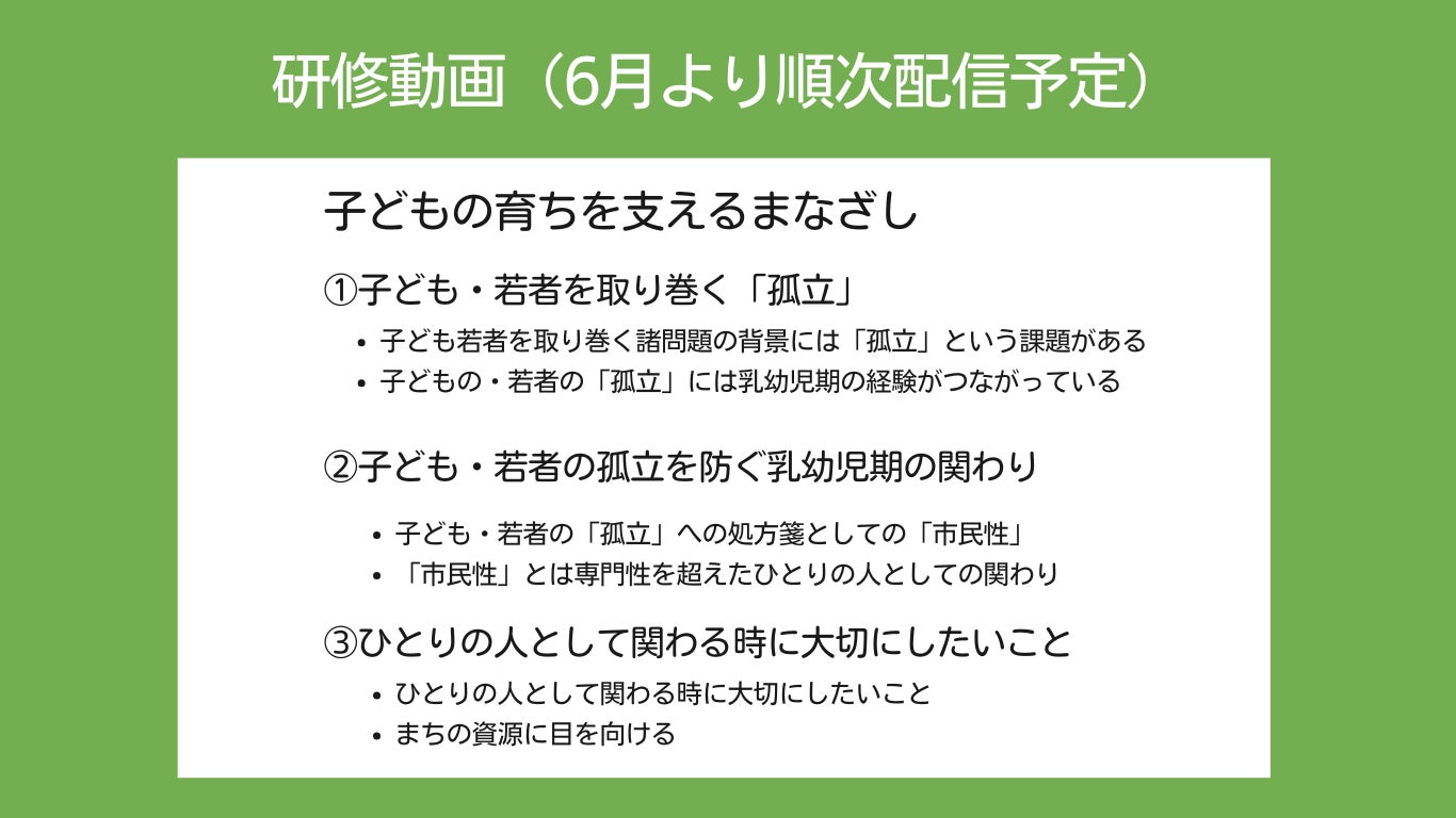 動画配信では、「子どもの育ちを支えるまなざし」と題したものが3本、「子どもとの関わりを考える」と題したものを2本、合計5本を配信予定。子どもの孤立の現状や日々の関わりの中で大切にしたい視点、子どもの権利からの視点などを5本の動画に凝縮してお届けします。また、同月にはリアルタイムで行うライブ研修も実施いたします。