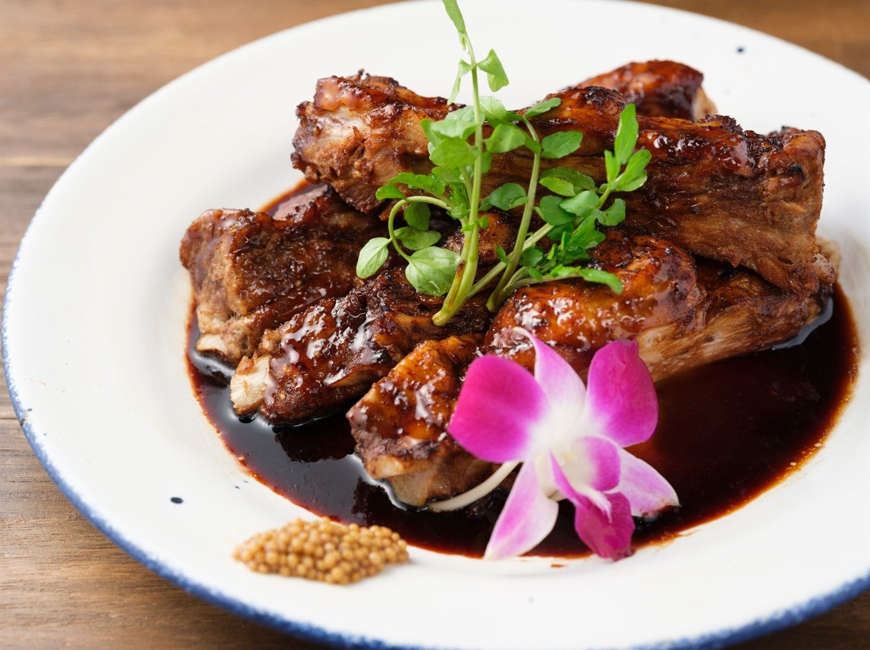 国産豚を香味野菜で丁寧に時間をかけて煮込み、自家製の濃厚ソースをつけて、オーブンで二回に分けて焼き上げたスペアリブ。味がしっかりとしみ込んだ柔らかくジューシーなリブと甘みのあるソースの相性が抜群。