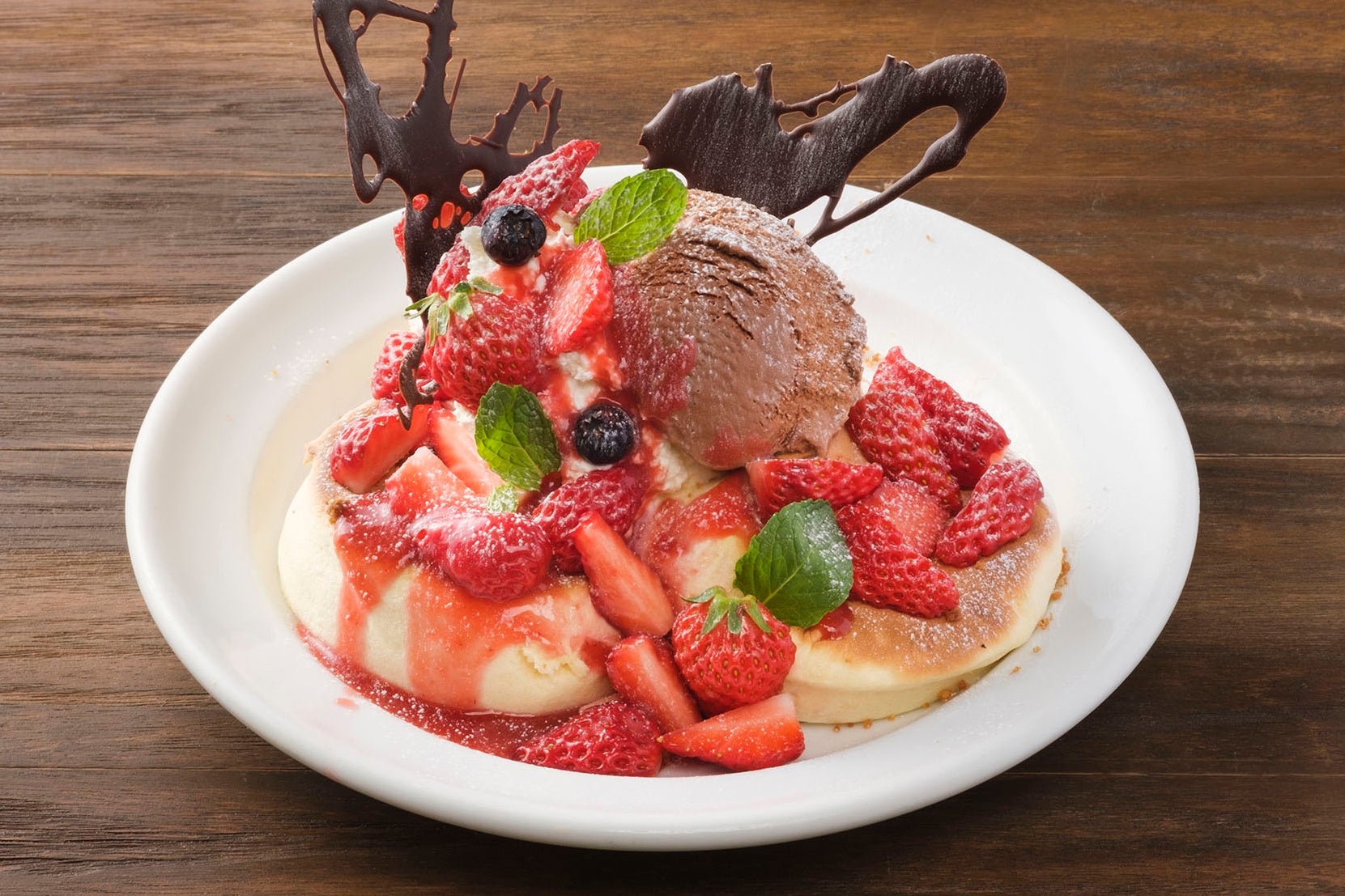甘酸っぱい苺と甘く濃厚なチョコレートジェラートの相性と共に楽しめるパンケーキです。