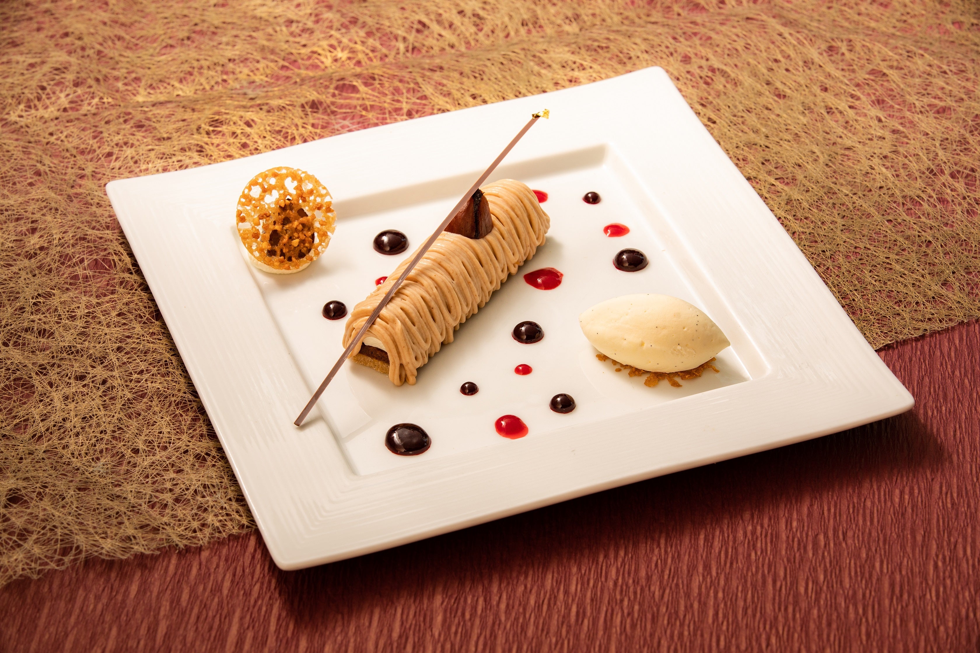 「栗のパートフィロ包み」は、シナモンが香り立つ、栗の甘味やほくほくした食感がダイレクトに味わえる温かいデザートです。渋皮栗と一緒に栗のアーモンドクリーム、黄栗の餡を包んだ、パティシエおすすめの一品です。