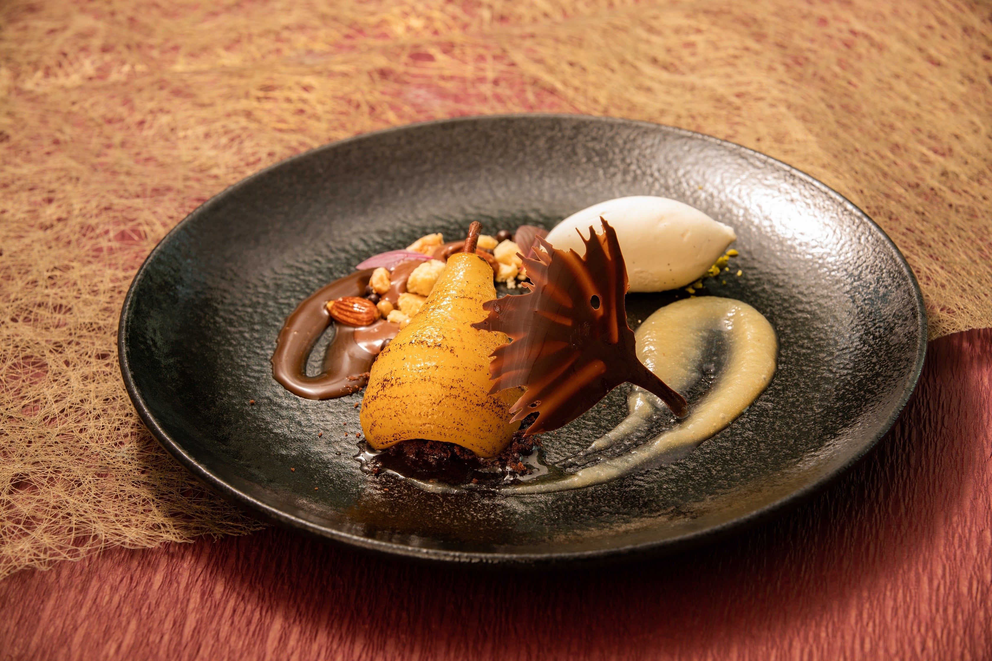 「洋梨のキャラメリゼ」は、フランス産洋梨のコンポートをキャラメリゼし、フレッシュな洋梨のピュレとビターな塩キャラメルの2種類のソースで味わいの変化をお楽しみいただけます。