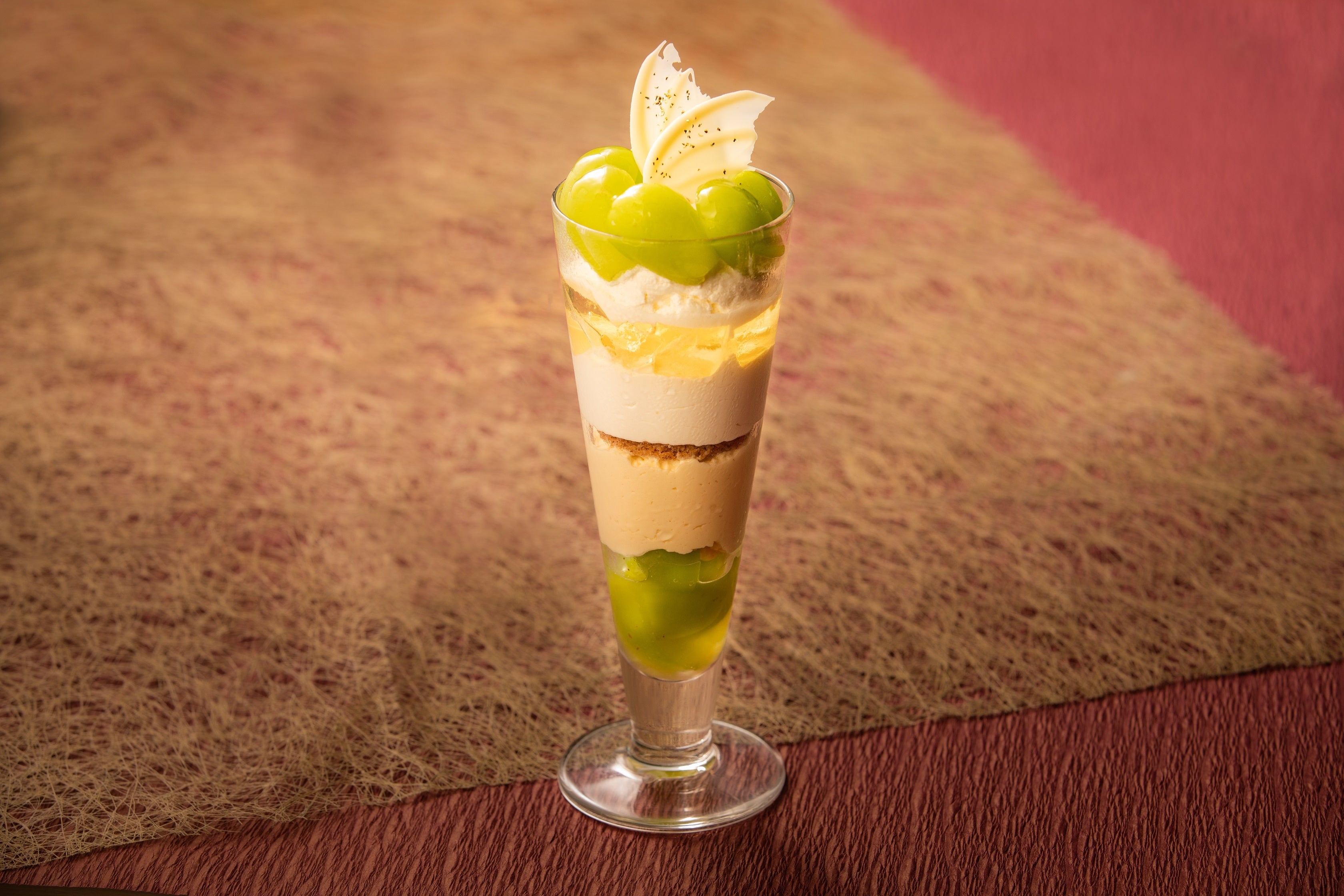 「シャインマスカットパフェ」は、シャインマスカットの素材を活かし、貴腐ワインや白ワインのムースで味の統一感を持たせながら、それぞれの層で異なる食感と味わいをご堪能いただけます。