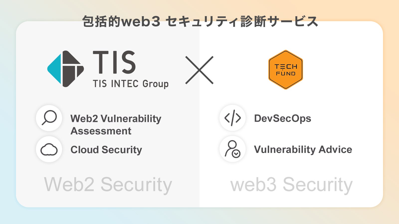 そこでweb3システムのセキュリティ診断で豊富な専門知識を持つTECHFUNDとWeb1から始まりWeb2、web3の領域までITで社会基盤を支えてきたTISが共同で、新たに「web3セキュリティ診断サービス」の提供を開始し、Web2からweb3領域までをカバーした包括的なセキュリティ対策を支援します。