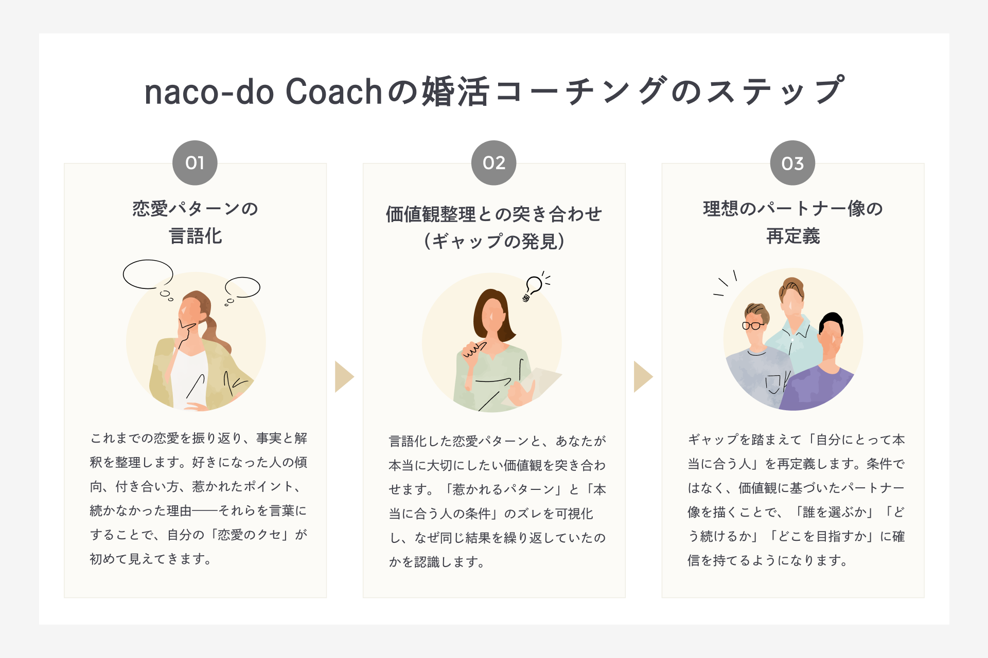 こうした背景から、パーソナル婚活 naco-do(ナコード)を運営してきた弊社では、これまでの婚活支援で培ってきたコーチングのノウハウを体系化し、幸せな結婚につながる「相手の見極め方」と「関係性の築き方」を専門コーチが伴走するパーソナル婚活コーチング「naco-do Coach(ナコードコーチ)」を開発しました。