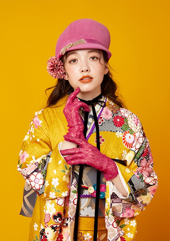 流行りの「レトロ感」のあるどこか懐かしい花柄や色味に、新鮮な小物使いで斬新なコーディネートに仕上げたモダンタイプ。鮮明で目立つ原色をふんだんに使いつつも、大人の落ち着きのある花柄を採用したデザインで現代的な印象を与えます。振袖を主役に、ハットやチョーカー、レースのグローブなど、個性的な小物を使用し、型にはまらない本コレクションから自分だけのこだわりを見つけていただけるよう提案しています。金箔・水引を使ったヘアアレンジなど、旬のスタイリングもご紹介しています。