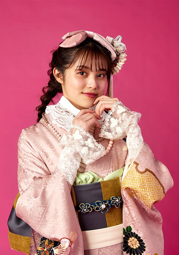 乙女心を満たしたい、いつだってとびきりかわいくいたいお嬢様には、明るく華やかなキュートタイプの振袖がおすすめです。トレンドのくすみカラーや、柔らかい印象のパステルカラーを採用し、最新の“可愛い”が詰め込まれています。とことん「かわいい」を追求できる、大きなリボンのアクセントや、チュール、お花をふんだんに使ったヘアスタイルも必見。枠にとらわれず、手元と襟のレースをあしらうことで、女の子らしい“好き”をつめこんだコレクションとなっています。