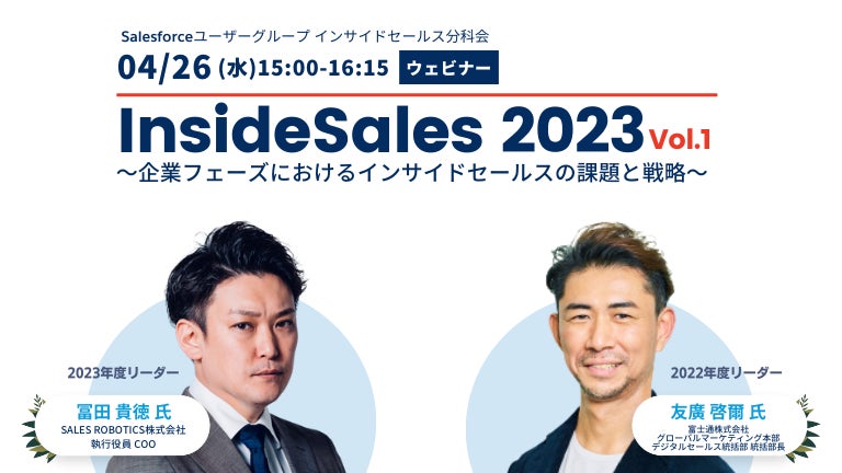 そこで今回は2023年度新リーダーのお披露目式も含め、前リーダーの富士通株式会社 友廣 氏と2023年度の新リーダーとなられるSALES ROBOTICS株式会社 冨田 氏のお二人で「企業フェーズにおけるインサイドセールスの課題と戦略」について幅広くお話しいただきます。