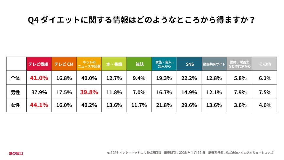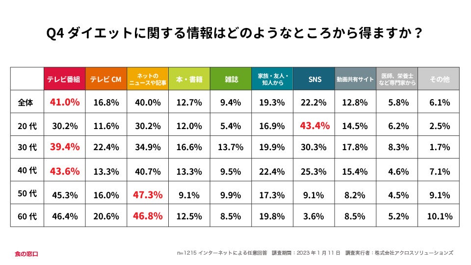 一方、20代がダイエット情報を得る際に最も利用しているメディアは「SNS」であることも分かりました。