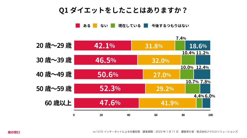 株式会社アクロスソリューションズと一般社団法人 日本唐揚協会が共同運営している食の窓口(URL:https://karaage.ne.jp/contents/ )は、20歳〜60歳以上の男女1215人を対象に「ダイエットと宅配弁当に関するアンケート調査」を実施しました。